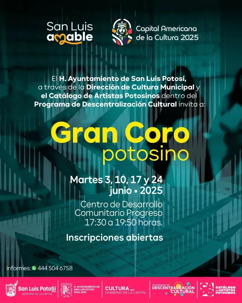 La creación del Gran Coro Municipal Potosino se está realizando en el Centro de Desarrollo Comunitario de Simón Díaz, las sesiones próximas son 16, 23 y 30 de junio; mientras que en el Centro de Progreso se realizarán el 17 y 24 de junio, habiendo todavía espacios disponibles.