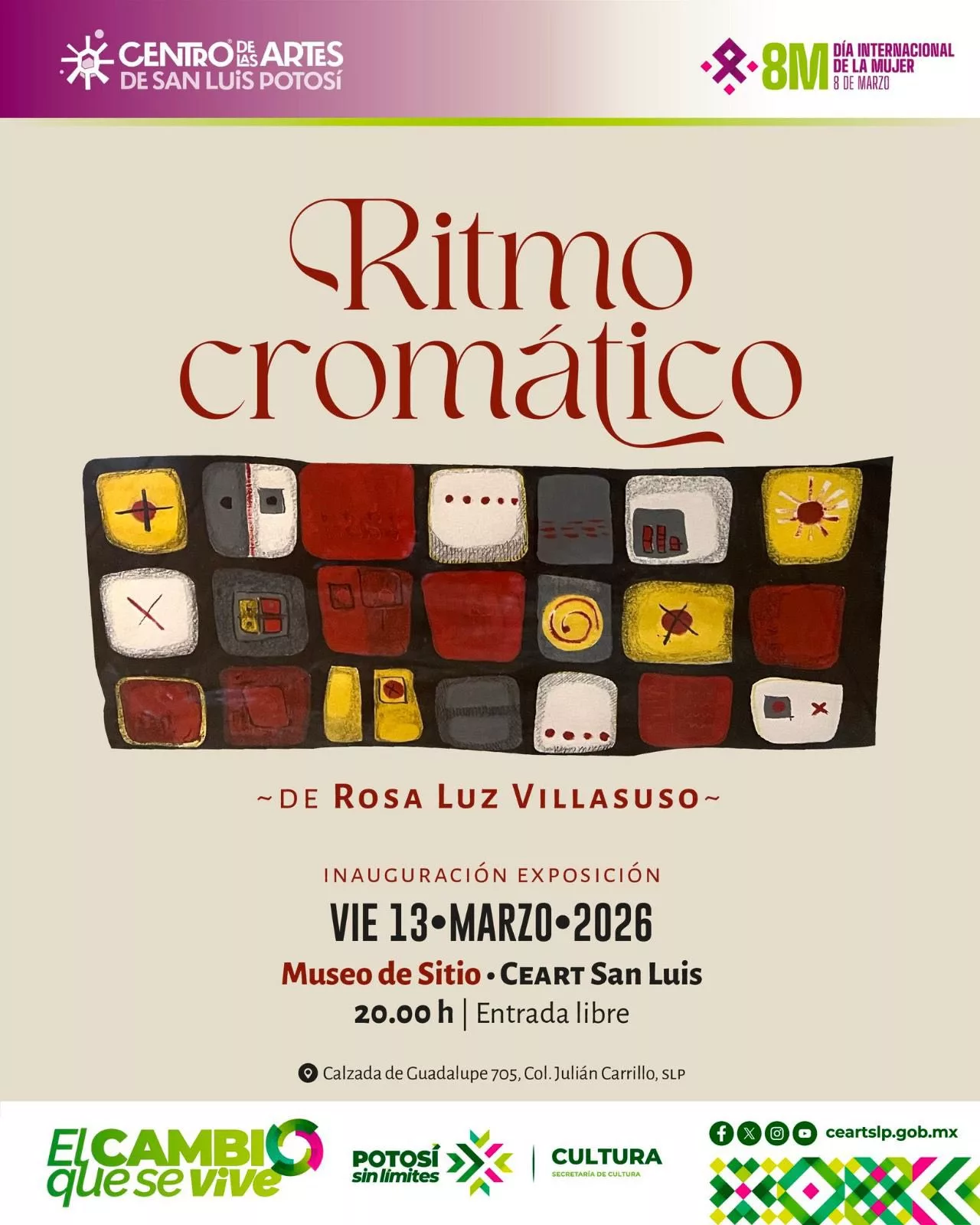 El Centro de las Artes de San Luis Potosí invita a la inauguración de la exposición Ritmo Cromático de la artista potosina Rosa Luz Villasuso, que se llevará a cabo este viernes 13 de marzo a las 20:00 horas en el Museo de Sitio del CEART San Luis, con entrada libre.