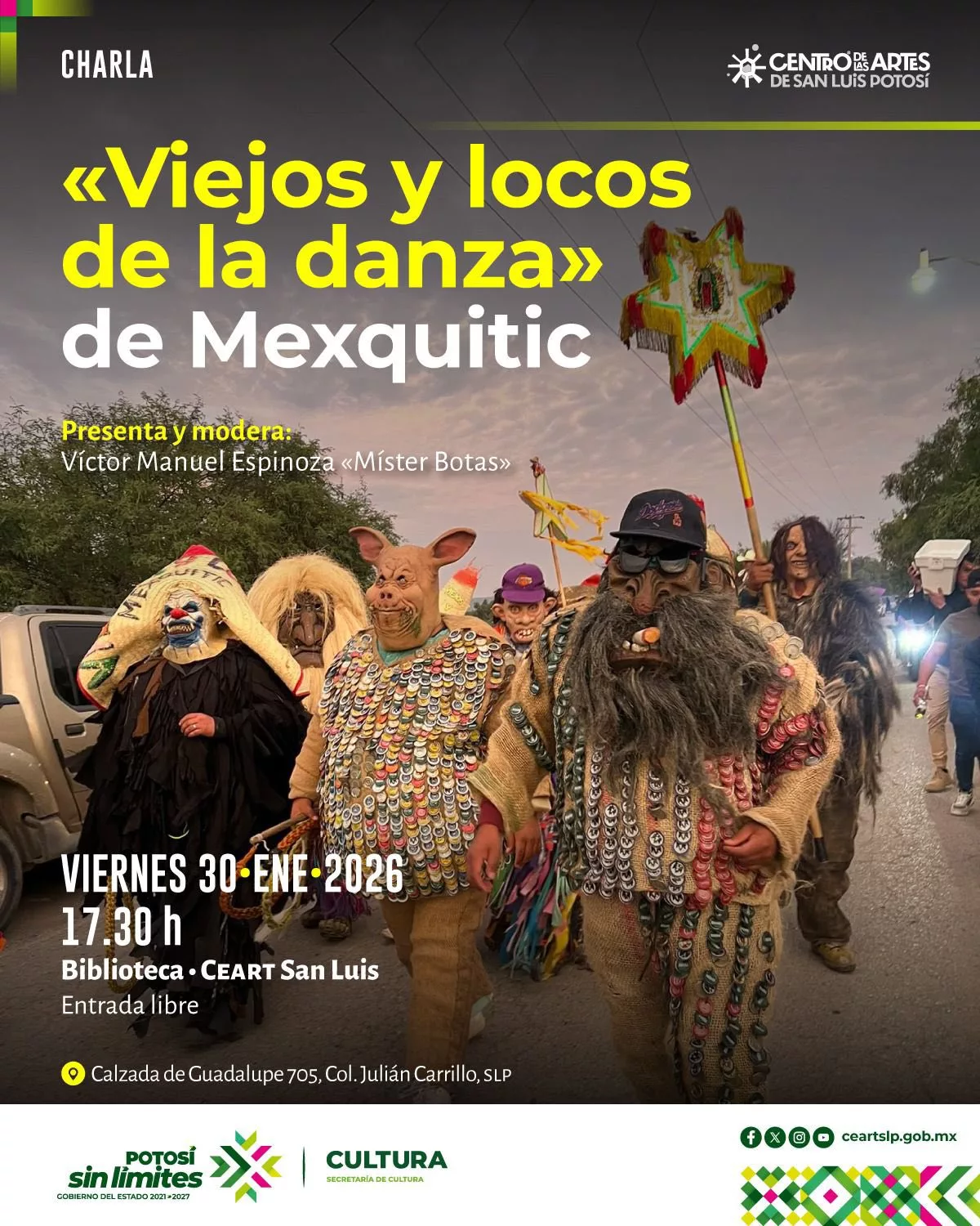 Con esta actividad, el Centro de las Artes de San Luis Potosí refrenda su compromiso de abrir espacios de diálogo y reflexión en torno a la cultura popular, la tradición oral y la memoria histórica, promoviendo el encuentro entre la comunidad y las expresiones que dan identidad a los pueblos y barrios de San Luis Potosí.