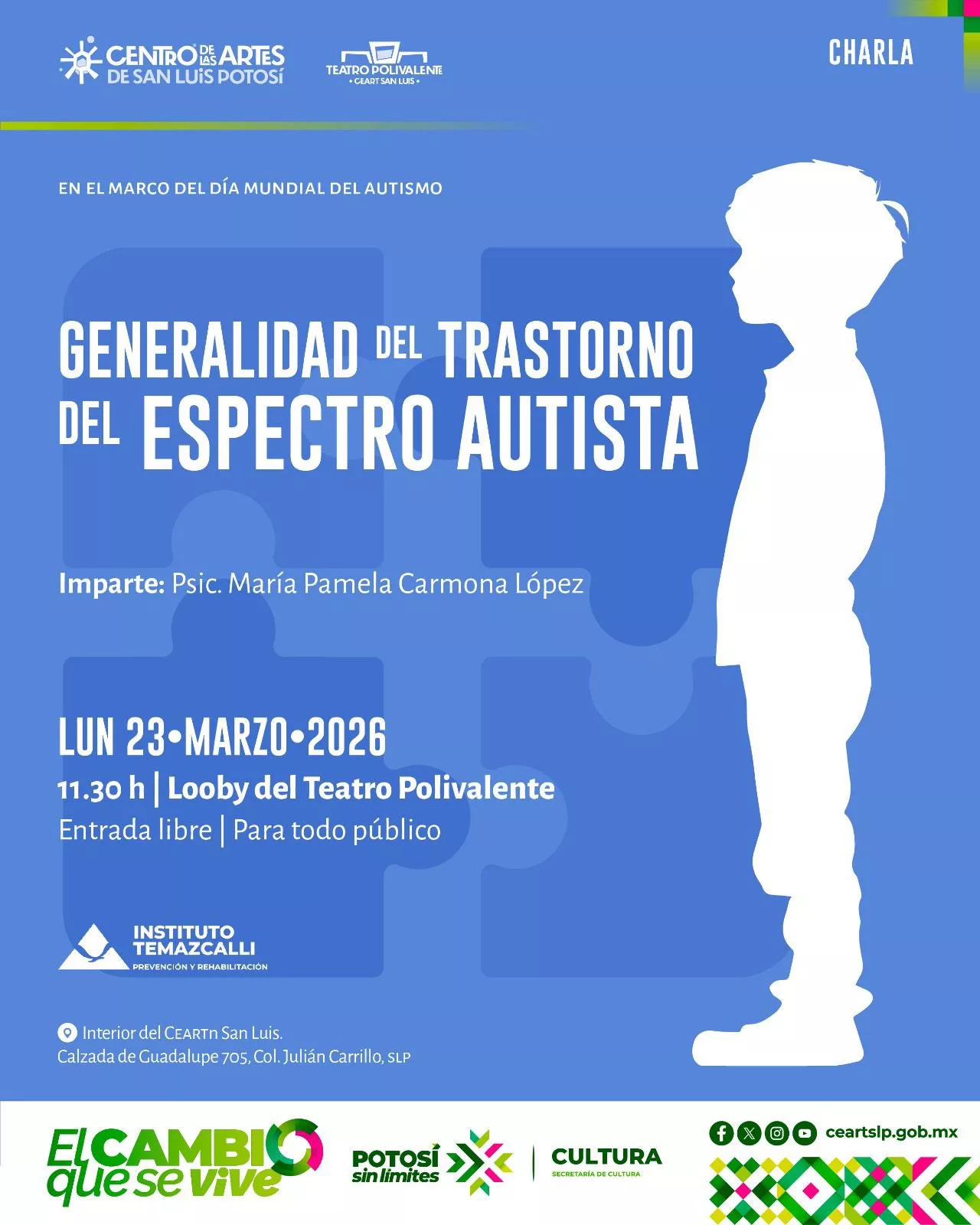El Centro de las Artes de San Luis Potosí invita al público en general a la charla “Generalidad del Trastorno del Espectro Autista”, que se llevará a cabo el próximo lunes 23 a las 11:30 horas en el Lobby del Teatro Polivalente, con entrada libre.