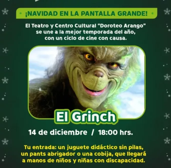 La Dirección de Cultura y Turismo proyectará películas como “Pinocchio” el 11 de diciembre a las 18:00 horas, “El Grinch” el 14 de diciembre a las 12:00 horas y “Los Gremlins” el 21 de diciembre a las 12:00 horas, que llenarán de espíritu navideño este emblemático recinto, con lo que el Gobierno Municipal reafirma su compromiso de escuchar y atender a la población, mediante espacios donde la convivencia y la solidaridad van de la mano.