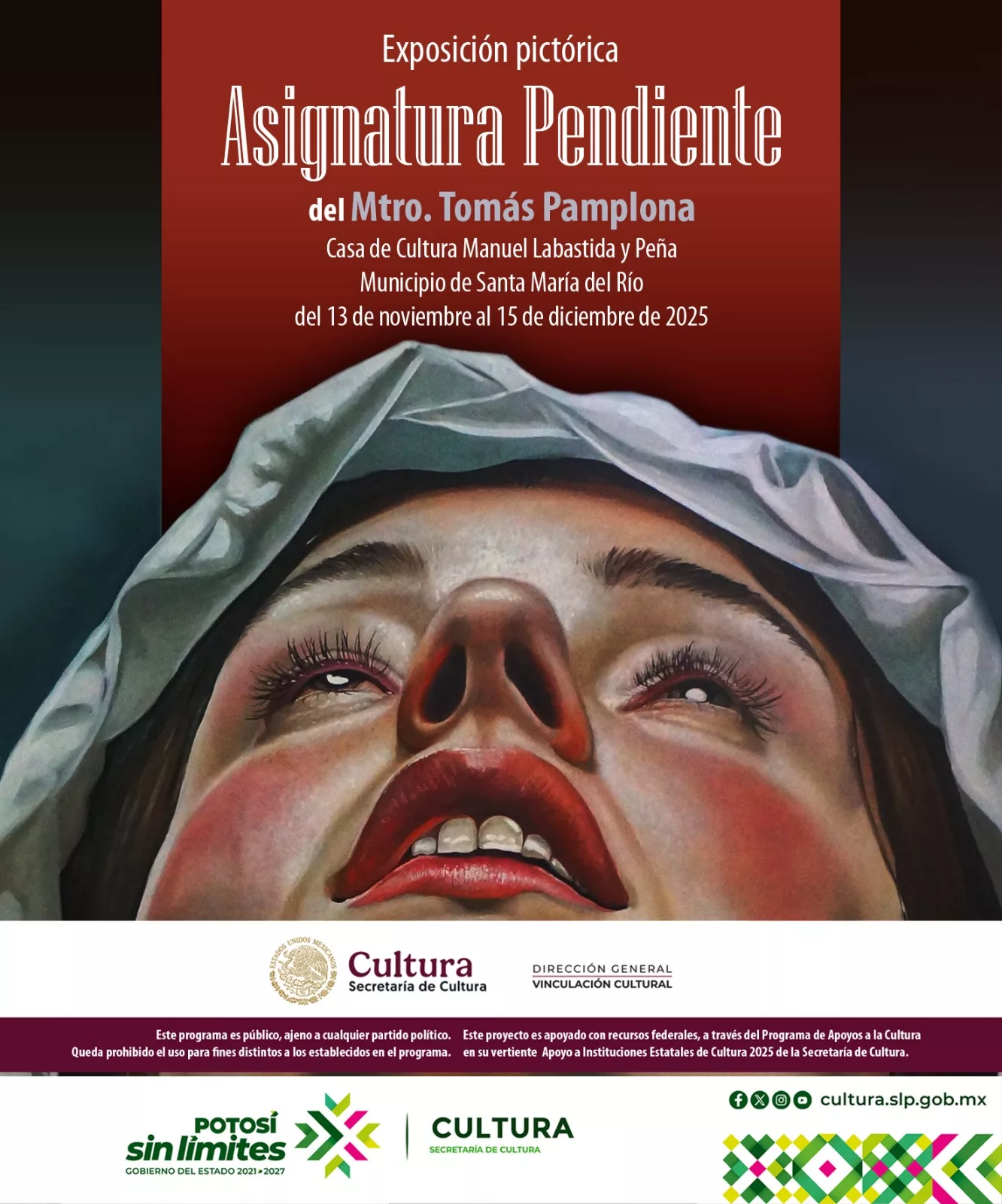 Asimismo, en Coxcatlán, la exposición “La Vida en Rojo” de Pilar de la Rosa Dibildox puede visitarse en los locales 50 y 51 del Mercado Municipal, del 14 de noviembre al 15 de diciembre de 2025. Finalmente, en Santa María del Río, se exhibe “Asignatura Pendiente” del Mtro. Tomás Pamplona en la Casa de la Cultura Manuel Labastida y Peña, disponible del 13 de noviembre al 15 de diciembre de 2025.