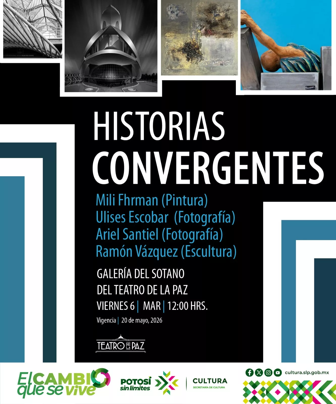 La Secretaría de Cultura de Gobierno del Estado invita al público en general a la inauguración de la exposición Historias Convergentes, de Mili Fhrman, Ulises Escobar, Ariel Santiel y Ramón Vázquez, que se llevará a cabo el 06 de marzo a las 12:00 h, en la Galería Sótano del Teatro de la Paz, entrada libre.