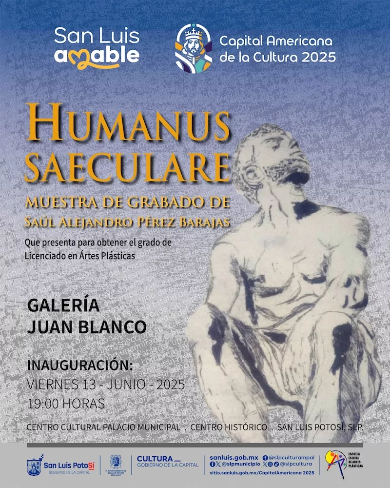 El Gobierno de la Capital, a través de la Dirección de Cultura Municipal, invita a la ciudadanía a la inauguración de la exposición “Humanus Saeculare”, del artista Saúl Alejandro Pérez Barajas, este viernes 13 de junio a las 19:00 horas en el Centro Cultural Palacio Municipal, en la Galería Juan Blanco. La entrada es libre y la muestra estará abierta al público todos los días de 9:00 a 20:00 horas, hasta el domingo 22 de junio.