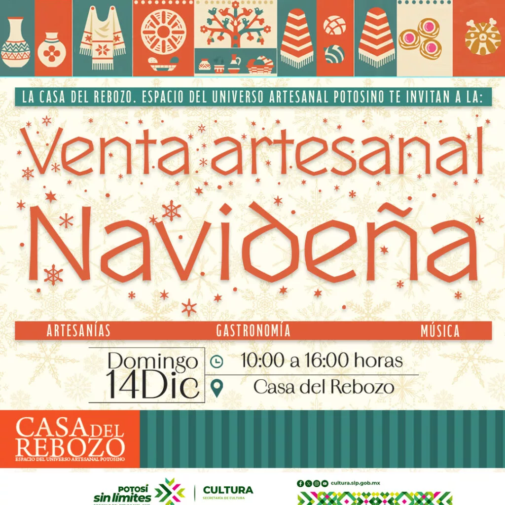 La Secretaría de Cultura de Gobierno del Estado invita a celebrar estas fiestas decembrinas con la Venta Artesanal Navideña en la Casa del Rebozo, que se realizará el domingo 14 de diciembre de 2025, en un ambiente festivo que busca promover el talento de las y los artesanos de Santa María del Río, reconocido por su tradición textil y por la calidad de sus piezas hechas a mano.