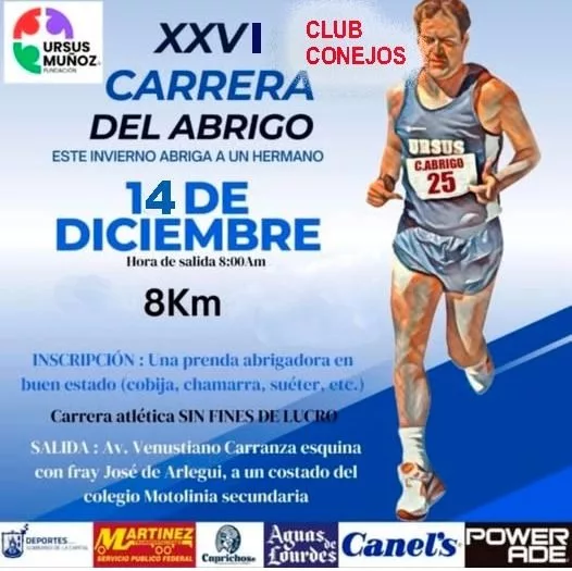 ¡Este invierno, abriga a un hermano!, es el lema de la lid altruista, que en esta ocasión organizan el Club Conejos Runners y la Fundación Ursus Muñoz quienes convocan a los deportistas y ciudadanía en general a que participen, ya sea caminando, trotando o corriendo.