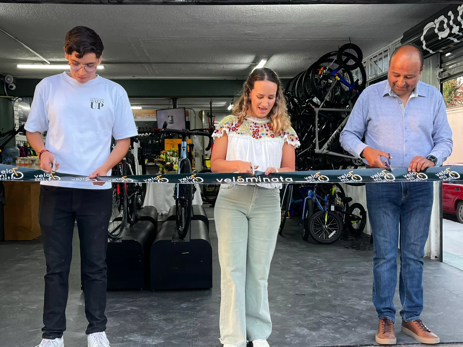 El corte de listón del moderno establecimiento estuvo encabezado por Macarena Barroso; Luis Pineda, coordinador de Velominata en San Luis, y Manuel Cruz, Presidente de Fomento Potosino al Ciclismo.