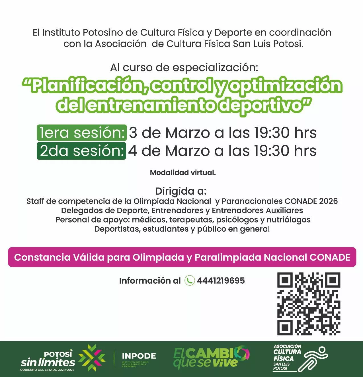 Con el respaldo del Gobernador del Estado, Ricardo Gallardo Cardona, el Instituto Potosino de Cultura Física y Deporte (Inpode), en coordinación con la Asociación de Cultura Física de San Luis Potosí, convoca al Curso de Especialización “Planificación, Control y Optimización del Entrenamiento Deportivo”, que se realizará los días 3 y 4 de marzo en modalidad virtual, como parte del cambio que se vive y se siente en la formación de profesionales mejor preparados en el ámbito deportivo.