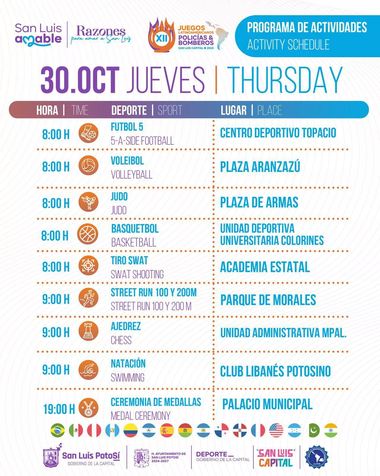 Este jueves 30 de octubre se vivirá una intensa jornada de competencias dentro de los XII Juegos Latinoamericanos de Policías y Bomberos San Luis Potosí 2025, con actividades deportivas programadas desde las 08:00 de la mañana en diferentes sedes de la capital potosina.