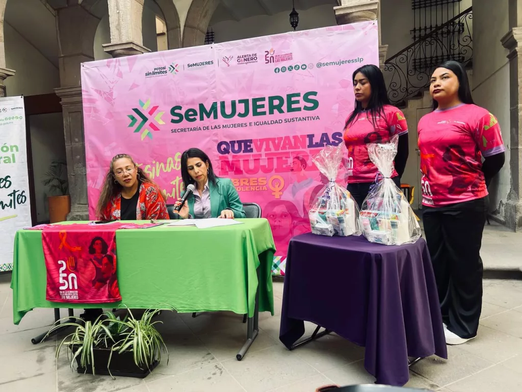 Gloria Serrato informó que la inscripción a la carrera será con causa y consistirá en entregar un kit de higiene personal y registrarse en la página https://semujeres-publico.slp.gob.mx/carrera_atletica; para dudas, está disponible el teléfono 444 144 2920 y las redes sociales de la Semujeres.