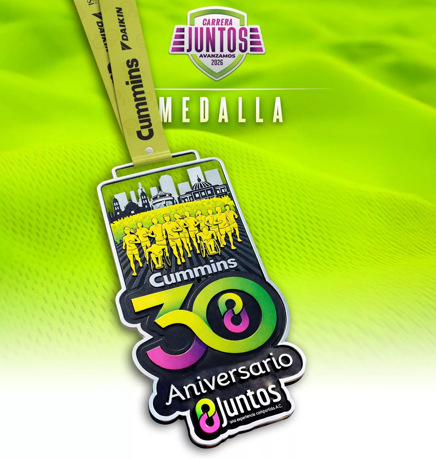 La medalla de la Carrera Juntos Avanzamos 2026 es una pieza conmemorativa diseñada para honrar tres décadas de historia, inclusión y transformación social. Su diseño tridimensional, fundido en una aleación de metal, representa la Marea Fosfo, un símbolo del movimiento colectivo, la fuerza y la visibilidad de las personas con discapacidad, así como de la lucha permanente por una sociedad más justa e incluyente.
