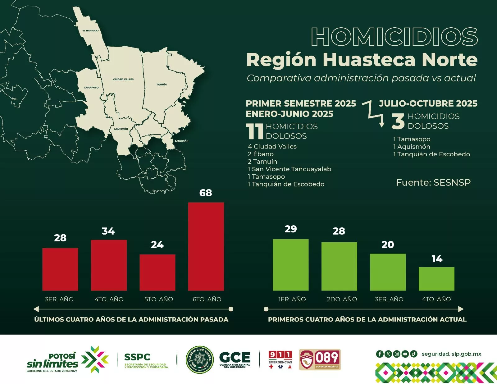 Asimismo, resaltó que el trabajo conjunto con la Federación y los Ayuntamientos ha permitido que San Luis Potosí mantenga una tendencia a la baja en los delitos de alto impacto, lo que refleja el compromiso del Estado por seguir construyendo comunidades más seguras y en armonía.