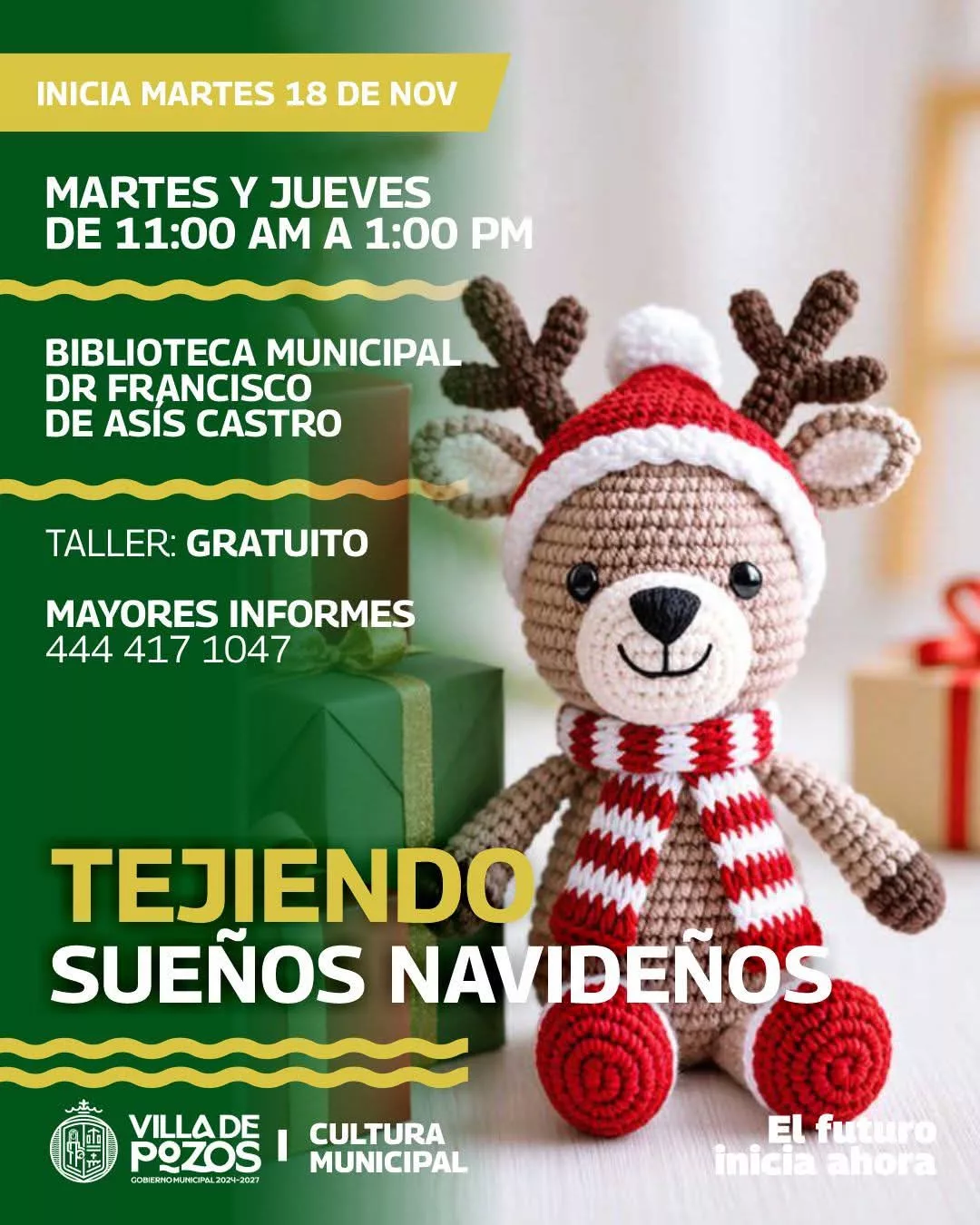 Los días martes y jueves se ofrece el taller “Tejiendo sueños navideños”, en un horario de 11:00 a 13:00 horas, dentro de las instalaciones de la Biblioteca Municipal Dr. Francisco de Asís Castro, en este espacio, las y los asistentes aprenden técnicas básicas y avanzadas de tejido para crear adornos pensados para la próxima temporada navideña.