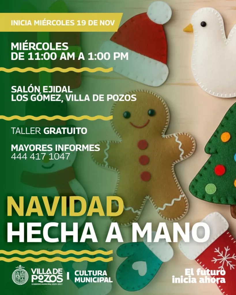 El Gobierno Municipal de Villa de Pozos, a través de la Dirección de Cultura, fortalece las actividades sociales mediante diversos talleres gratuitos que se imparten en diferentes puntos de la localidad, donde las y los participantes pueden desarrollar su creatividad al realizar decoraciones navideñas en fieltro y tejido.