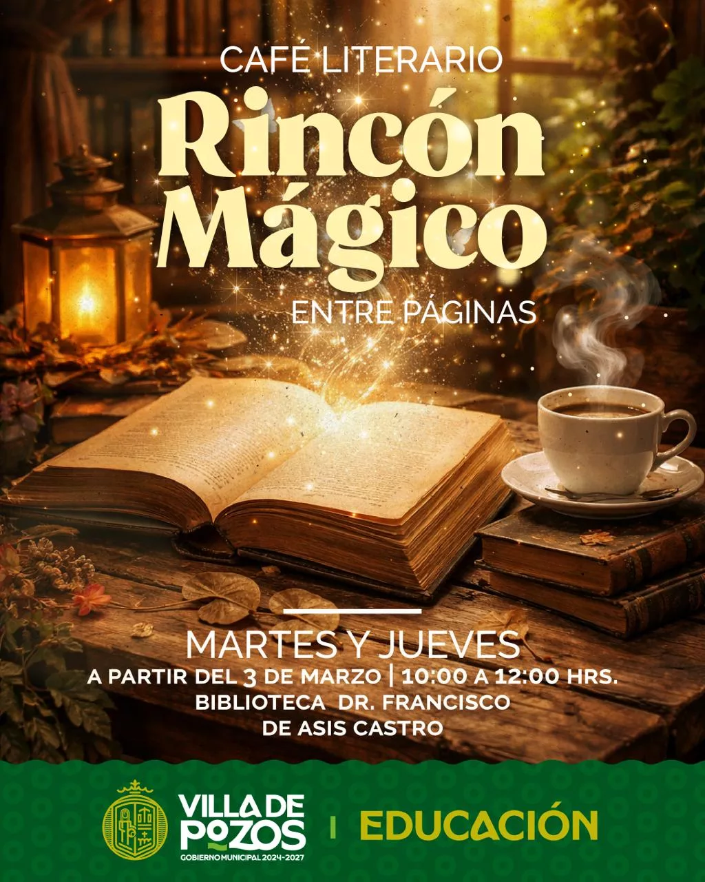 Con el propósito de fomentar la lectura, intercambiar ideas y crear espacios de encuentro cultural, el Gobierno Municipal de Villa de Pozos, a través de la Dirección de Educación, invita a la ciudadanía a formar parte de la actividad Café Literario “Rincón Mágico entre Páginas”, que iniciará el 3 de marzo y se llevará acabo los días martes y jueves, en un horario de 10:00 a 12:00 horas.