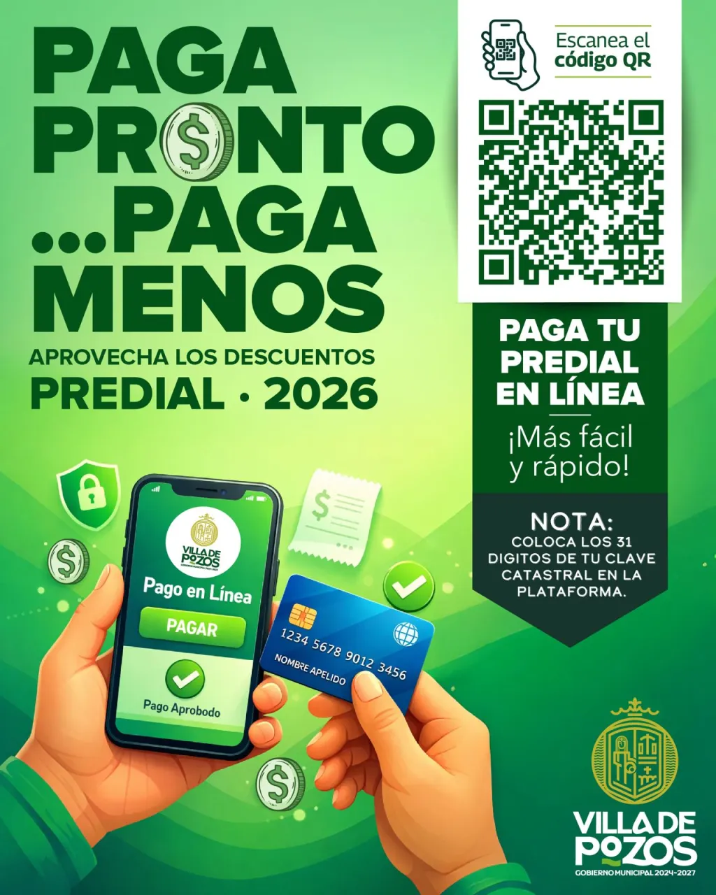 La Dirección de Ingresos informó que para realizar el pago en línea, las y los contribuyentes deben ingresar al portal https://servicios.villadepozos.gob.mx/public/predial, introducir los 31 dígitos de la clave catastral, consultar sus datos y efectuar el pago correspondiente. El sitio precisa que la información proporcionada será utilizada exclusivamente para generar el cobro del impuesto predial.
