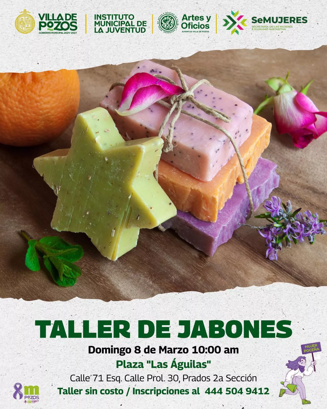 En el marco de actividades por la conmemoración del Día Internacional de la Mujer, el Gobierno de Villa de Pozos, a través del Instituto Municipal de la Juventud y la Escuela de Artes y Oficios, en coordinación SeMUJERES, invita a las mujeres poceñas a participar en el Taller de Elaboración de Jabones, que se llevará a cabo el próximo domingo 8 de marzo a las 10:00 de la mañana.