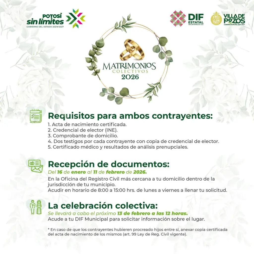 Para brindar certeza legal a las parejas que viven en unión libre, el Concejo Municipal de Villa de Pozos convoca a que participen en el programa de matrimonios colectivos, que se llevará a cabo el próximo 13 de febrero, a las 12:00 horas, en una ceremonia simbólica organizada por el DIF Estatal.