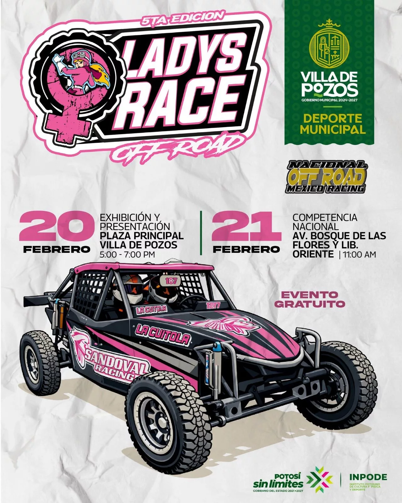 El Gobierno de Villa de Pozos, a través de la Dirección de Deporte y en coordinación con National Off Road México Racing, llevará a cabo la quinta edición de la competencia nacional “Ladys Race Off Road”, evento en el que el municipio será sede y que reunirá a destacadas pilotos de diferentes estados del país