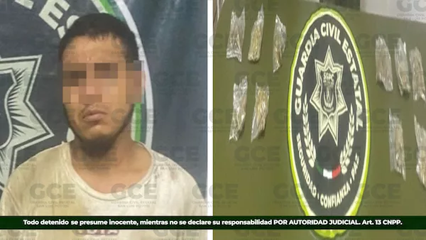 Nuestros agentes de la Guardia Civil Estatal con la finalidad de inhibir conductas delictivas así como el combate contra el narcomenudeo en la Huasteca potosina, detuvieron a Carlos “N” de 26 años, quien llevaba consigo 10 bolsas con marihuana en la carretera federal 85, en las inmediaciones de la colonia Lomas de Oxitipia, en el municipio de Ciudad Valles.