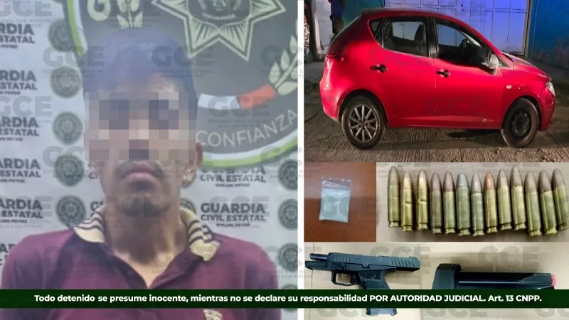 Un dispositivo implementado por nuestros agentes de la Guardia Civil Estatal en la colonia Villa Alborada, en el municipio de Soledad de Graciano Sánchez, derivó en la detención de Gerardo “N” de 31 años, quien fue asegurado con un arma de fuego calibre .9 milímetros, 13 cartuchos del mismo calibre, un cargador, una dosis de “cristal” y un vehículo Seat Ibiza con placas del Estado de México.
