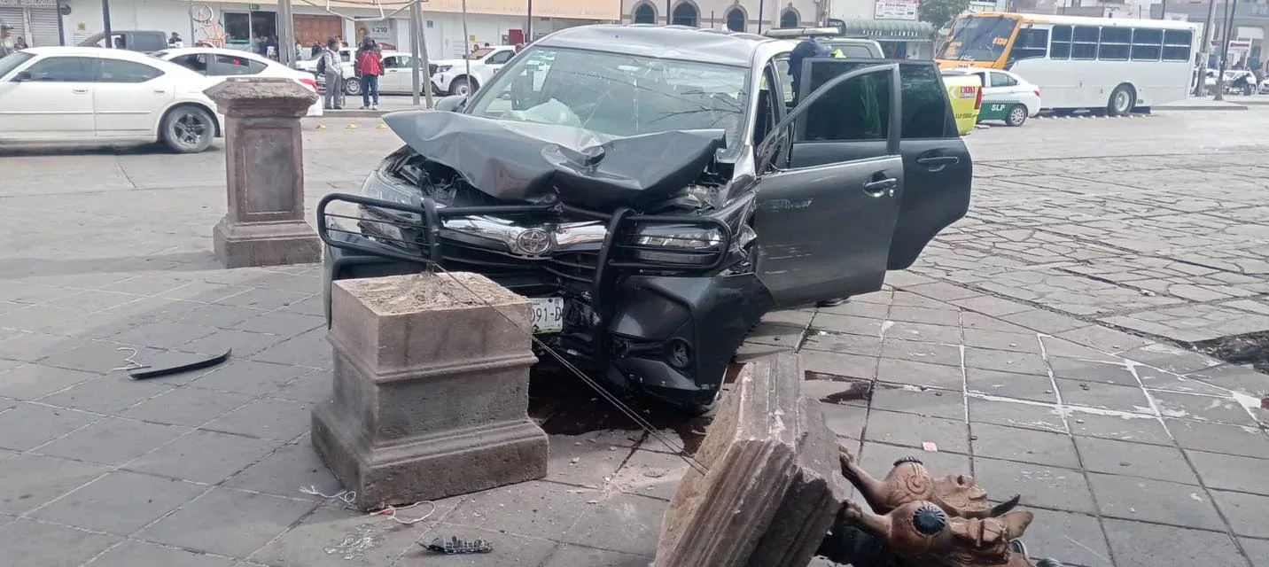 El conductor de una vagoneta marca Toyota Avanza color gris, perdió el control del vehículo e impactó de frente contra la base de mampostería de una lámpara de alumbrado público, ubicada en la intersección de las calles Manuel José Othón y Constitución en la Alameda Juan Sarabia.