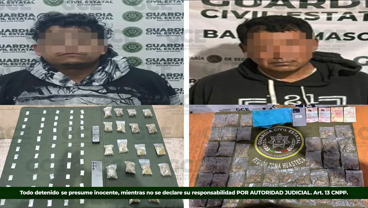 La Guardia Civil Estatal (GCE) reafirma su compromiso de construir un San Luis Potosí más seguro, a favor de la tranquilidad de la familias potosinas, por lo que detuvo a dos personas con estupefacientes así como dinero en efectivo, resultado de labores de inteligencia y vigilancia en áreas estratégicas de la Entidad.