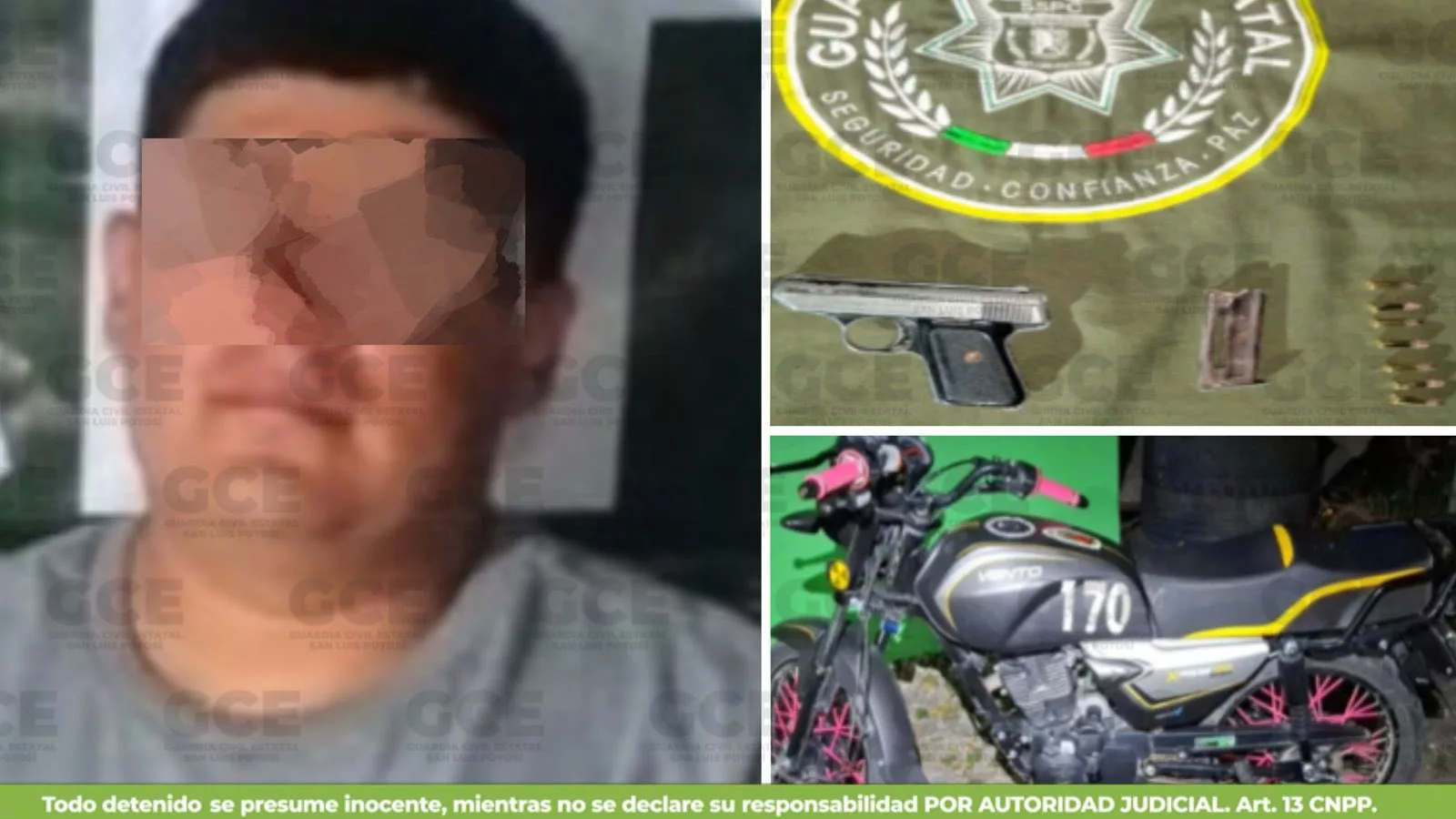 Durante las labores de seguridad, efectuadas en el ejido Aureliano Manríquez, un hombre identificado como Eduardo “N” de 27 años, fue detenido por agentes de la Guardia Civil Estatal y personal de la Defensa, tras asegurarle un arma de fuego calibre .22 milímetros. Además de un cargador, siete cartuchos útiles y una motocicleta marca Vento, modelo 2026.