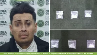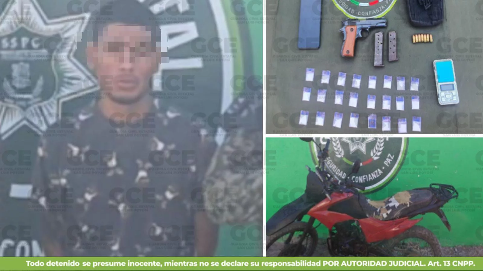 El presunto, Wilver “N” de 23 años, fue detenido con un arma de fuego, tipo pistola, calibre .380, con dos cargadores y siete cartuchos útiles, 24 dosis de “cristal”, una motocicleta vento modelo 2022, color rojo, un teléfono celular, una bascula y un bolso.