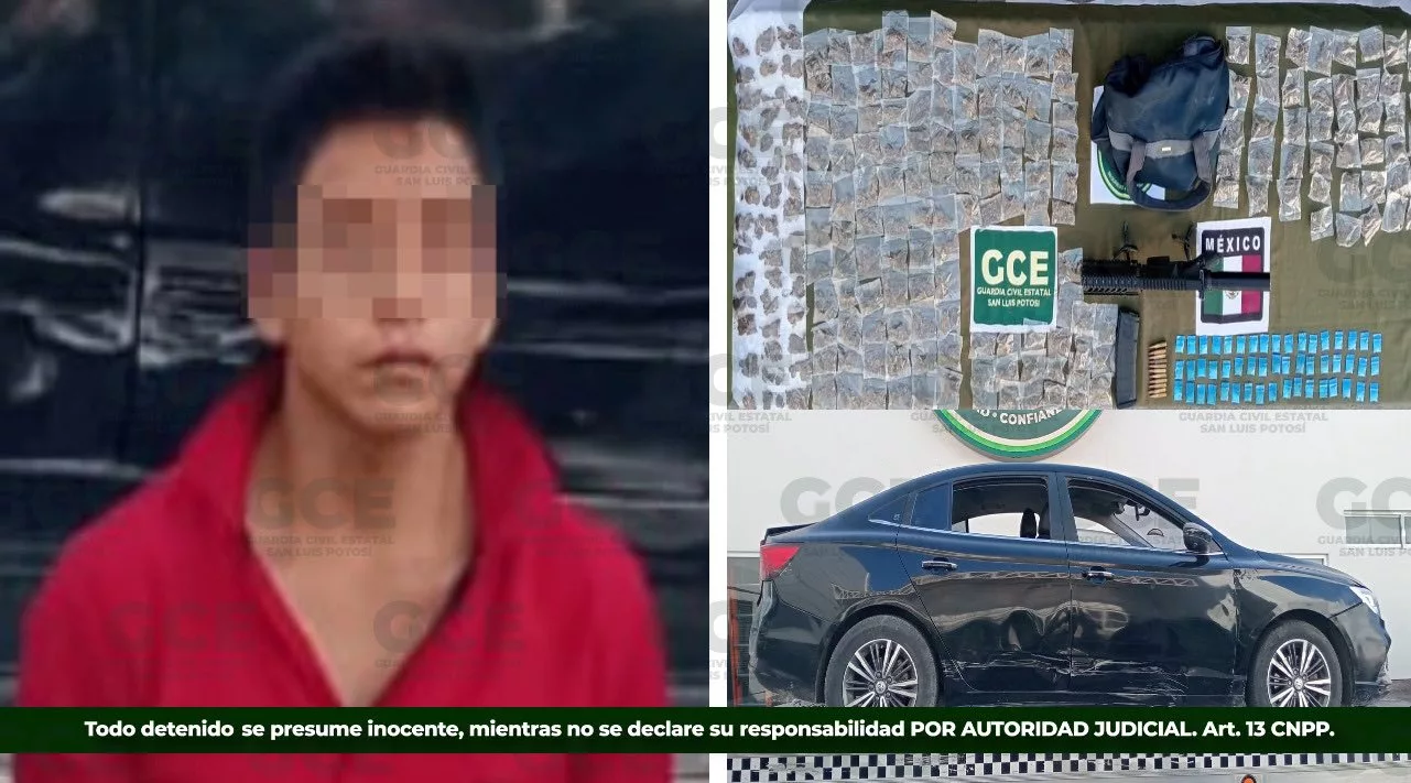 Como resultado de los trabajos preventivos, enfocados en preservar la paz de las familias de la región Huasteca, un hombre, presuntamente vinculado a la venta de estupefacientes, fue detenido en el municipio de San Martín Chalchicuautla. Se trata de Miguel “N” de 22 años, asegurado con más de un kilogramo de marihuana, distribuido en 382 bolsas, además de 51 dosis de “cristal”, un fusil de asalto, abastecido con un cargador que contenía 11 cartuchos útiles.