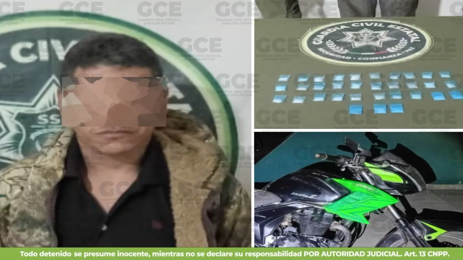 Mediante las labores de inteligencia, llevadas a cabo por nuestros agentes estatales en Tampacán, se logró la detención de un presunto distribuidor de narcóticos, identificado como Guejazi “N” de 41 años, luego de que se le aseguraran 33 dosis de “cristal” o metanfetamina, además de una motocicleta en la que se desplazaba.