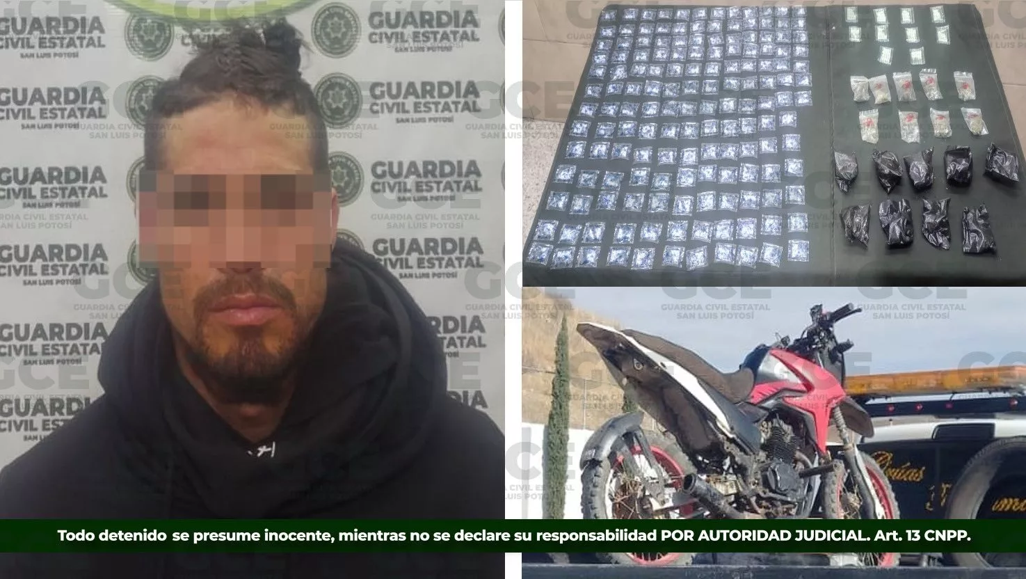 Tras las labores de inteligencia de la Guardia Civil Estatal en la localidad de Dulce Grande en el municipio de Villa de Ramos, se detuvo a Jonathan “N” de 28 años, presunto integrante de un grupo de delincuentes, al que se le aseguraron 150 dosis de la droga sintética conocida como “cristal”, además de 18 bolsas con marihuana, 10 dosis de cocaína y una motocicleta en la que se desplazaba.