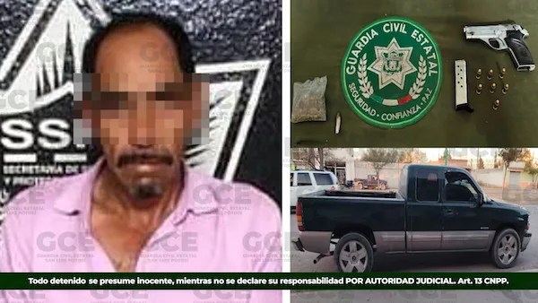 Derivado de estas acciones, se logró la detención de Fidel “N”, de 46 años, a quien se le aseguró una bolsa con hierba seca con características propias de la marihuana. Asimismo, al continuar con la revisión del vehículo en el que se desplazaba, una camioneta Chevrolet Silverado, modelo 2001 sin reporte negativo, se localizó y aseguró un arma de fuego tipo escuadra, calibre 32 milímetros, un cargador y siete cartuchos útiles del mismo calibre.