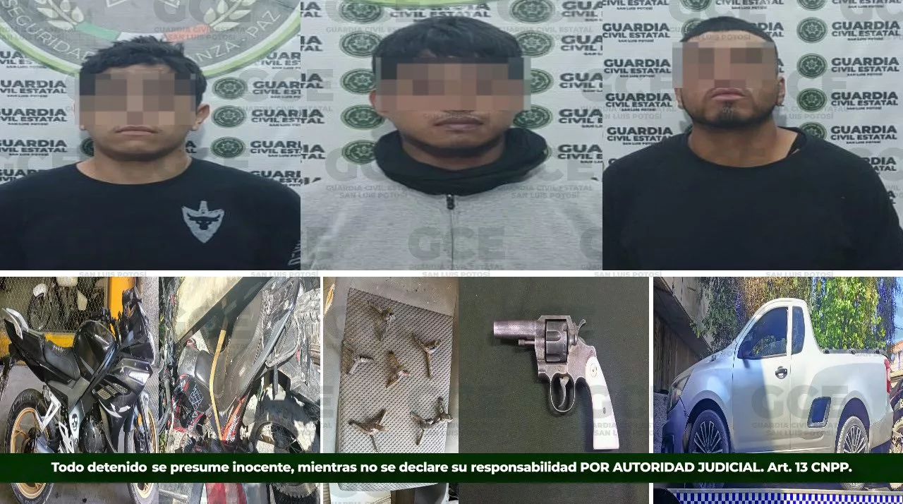 Agentes estatales aseguraron en la comunidad de El Saucillo, en el municipio de Villa de Reyes a Raymundo “N” de 21 años, Erik “N” de 22 años y Julián Eduardo “N” de 29 años, con un arma de fuego tipo revólver, ocho dosis de marihuana, siete artefactos “poncha llantas”, un vehículo y dos motocicletas.