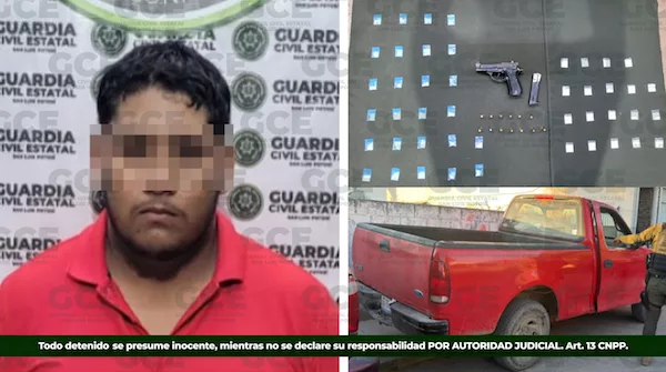 Al presunto, se le aseguraron 26 dosis de “cristal” y 19 dosis de cocaína, además de un arma de fuego calibre 9 milímetros, un cargador y 13 cartuchos útiles.
