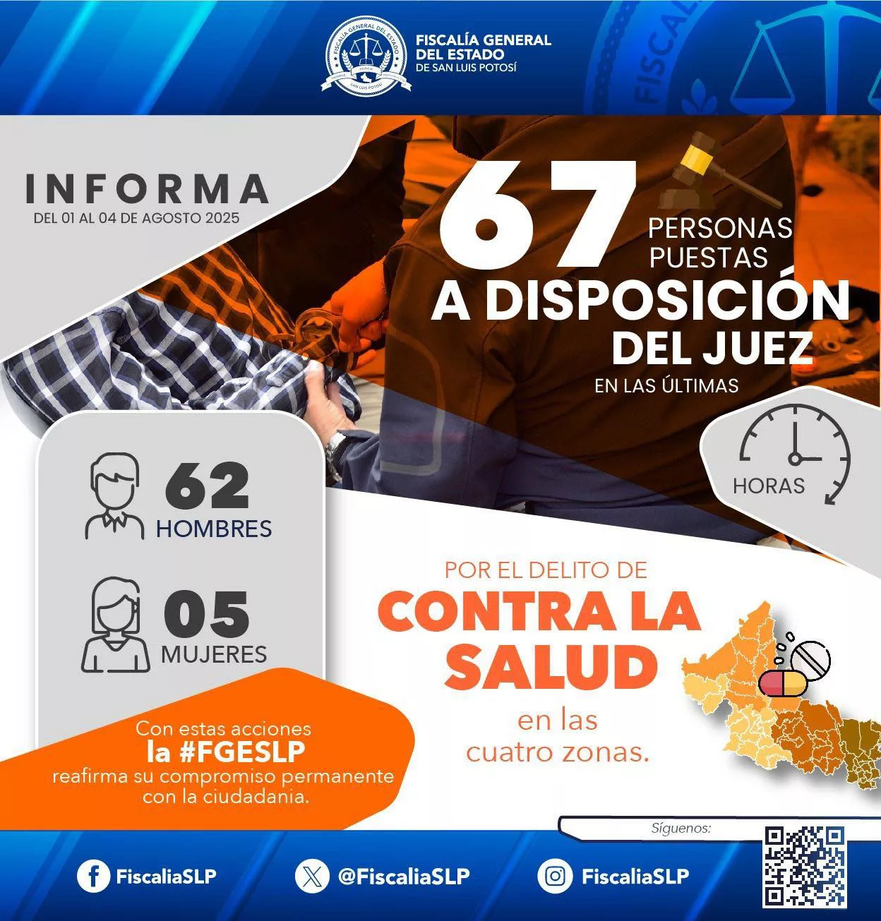 Como parte de las acciones para combatir los delitos contra la salud, la Fiscalía General del Estado de San Luis Potosí (FGESLP) llevó ante diversos jueces a 67 personas por su presunta participación en este ilícito, en sus distintas modalidades.