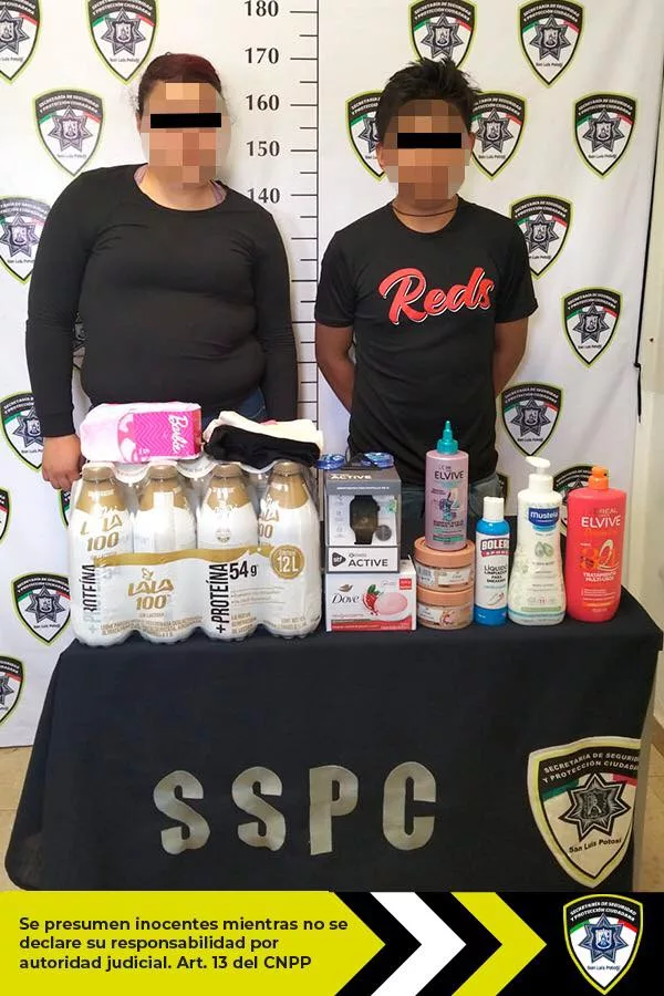 Los implicados, de nombre Roxana Michelle “N” de 23 años y Kevin Aldair “N” de 21 años, fueron detenidos en las inmediaciones, decomisándoles diversos productos con un valor total de 2 mil 224 pesos.