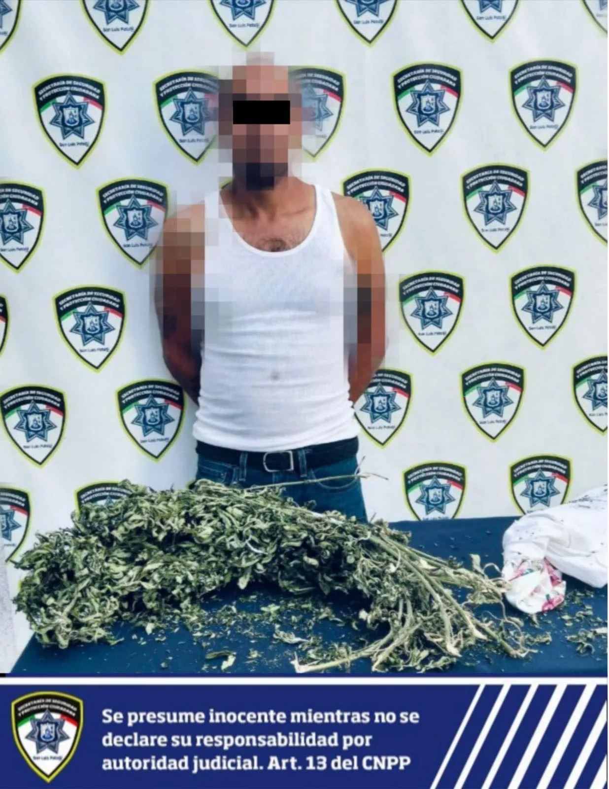 Fue entonces que el hombre adoptó una actitud violenta hacia los oficiales lanzando insultos y empujando a un agente para evitar su arresto. Luego de ser asegurado, se le realizó una revisión preventiva de seguridad encontrando que envuelta en una playera tenía una hierba seca verde con las características similares a la marihuana.