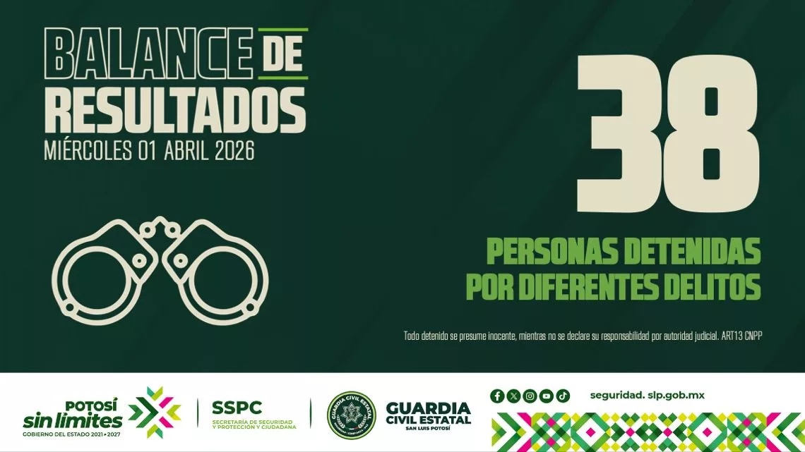 Como resultado de los operativos de seguridad, la Guardia Civil Estatal (GCE), detuvo a 38 personas en diferentes operativos por presuntos delitos contra la salud, ataques a las vías de comunicación, amenazas, robo y violencia familiar.