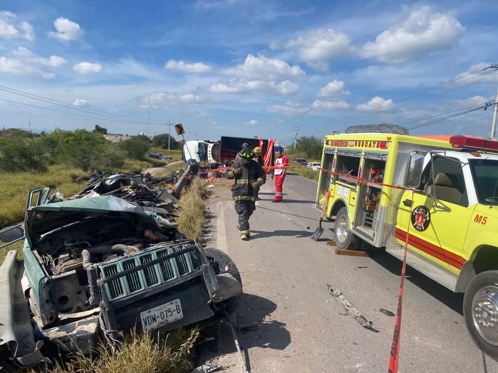 El impacto fue tan violento que uno de los ocupantes de la SUV quedó prensado entre los fierros retorcidos del vehículo, perdiendo la vida en el lugar del siniestro. La carretera quedó cubierta de cajas de tomate que se dispersaron por toda la cinta asfáltica, lo que complicó las labores de rescate y provocó un severo congestionamiento vial.