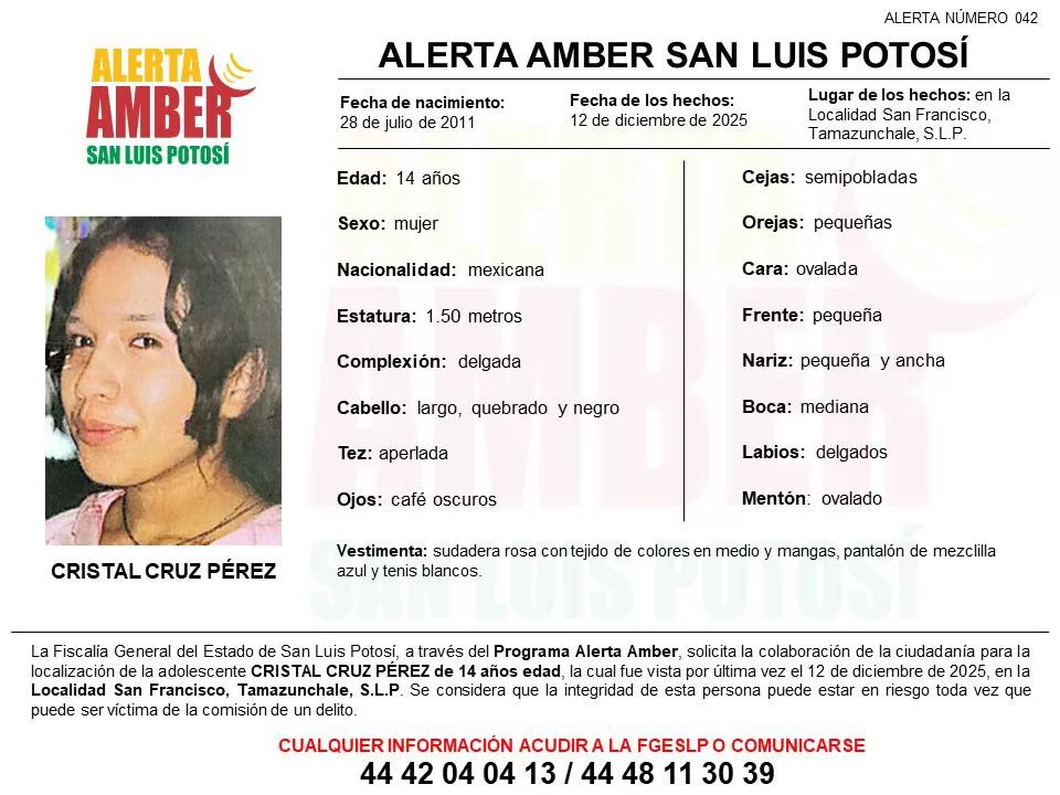 La Fiscalía General del Estado de San Luis Potosí (FGESLP) activó una Alerta Amber con el objetivo de localizar a Cristal Cruz Pérez, adolescente de 14 años de edad, quien fue vista por última vez el 12 de diciembre de 2025 en la localidad de San Francisco, municipio de Tamazunchale.