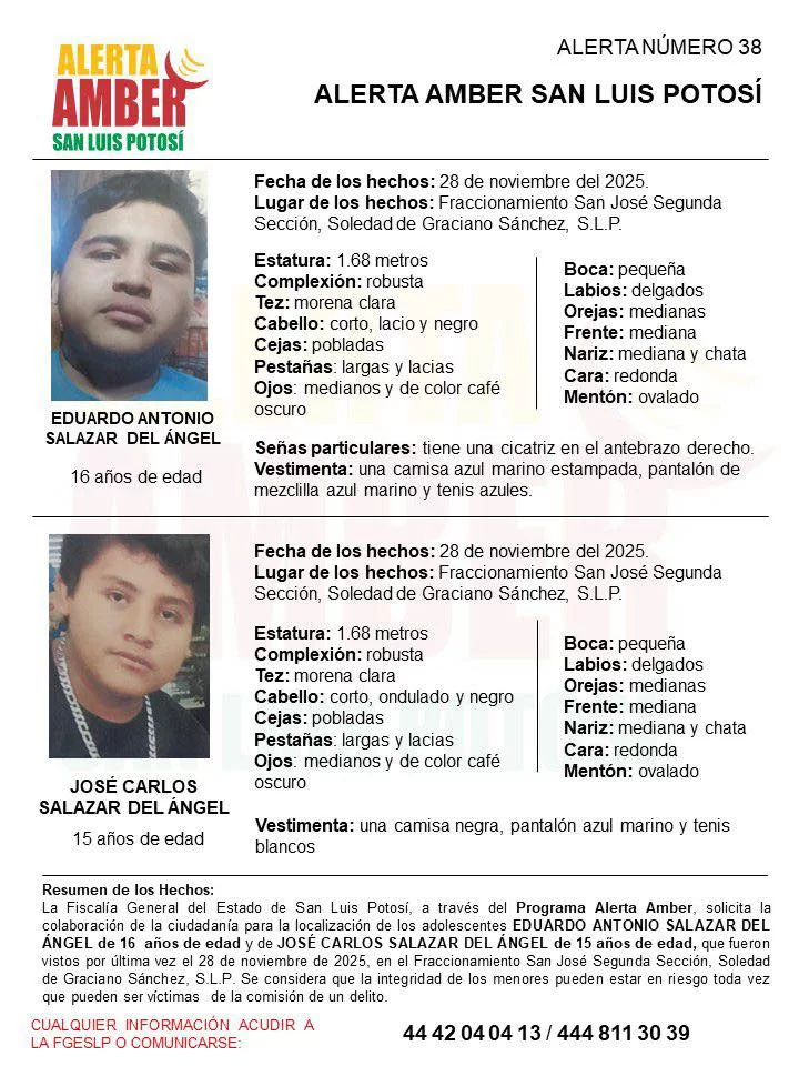 La Fiscalía General del Estado de San Luis Potosí (FGESLP) activó una ficha de Alerta Amber para la localización de Eduardo Antonio Salazar Del Ángel y José Carlos Salazar Del Ángel, de 16 y 15 años de edad respectivamente, quienes fueron vistos por última vez el 28 de noviembre de 2025 en el fraccionamiento San José Segunda Sección.
