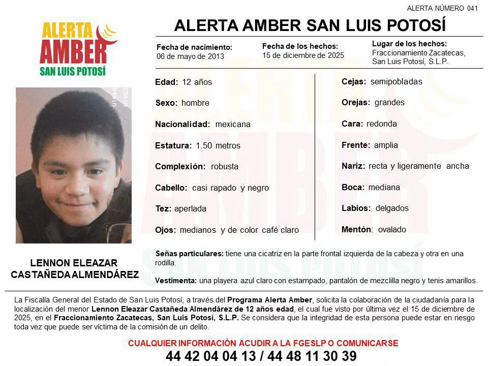 La Fiscalía General del Estado de San Luis Potosí (FGESLP) activó una ficha de Alerta Amber para la localización de Lennon Eleazar Castañeda Almendárez, quien tuvo contacto por última vez con sus familiares el 15 de diciembre de 2025, en el Fraccionamiento Zacatecas, de la capital potosina.