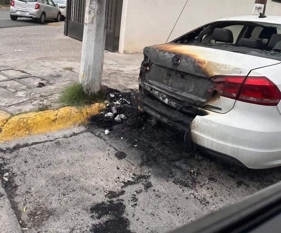 El coche está abandonado y el siniestro dejó daños visibles en la parte posterior, así como rastros de fuego en la banqueta, lo que generó preocupación entre habitantes del sector, quienes solicitaron la presencia de autoridades para descartar riesgos a las viviendas cercanas.