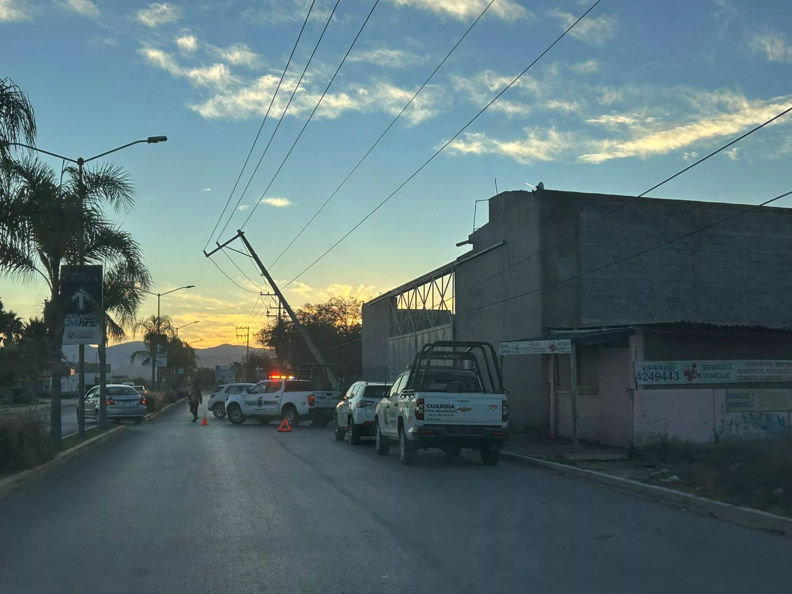 Derivado de un hecho de tránsito registrado durante la madrugada de este sábado, un poste de energía eléctrica fue derribado sobre la avenida Bosques de Las Flores, en el tramo comprendido entre la carretera 57 y la avenida Jocoyota.