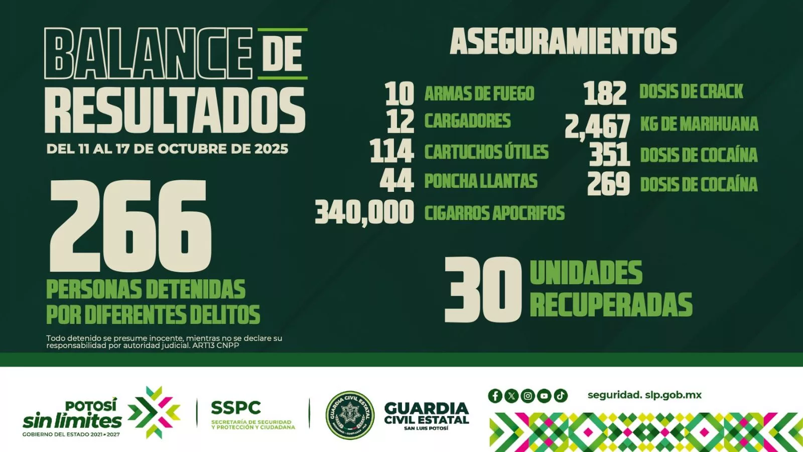 La Guardia Civil Estatal informó que, durante el periodo del 11 al 17 de octubre del presente año, se detuvo a un total de 266 personas, vinculadas a diversas actividades ilícitas, de las cuales, ocho fueron consideradas al rubro federal y 258 casos, al fuero común. Entre los operativos de búsqueda de vehículos, se reportó la localización de 23 automotores y siete motocicletas.