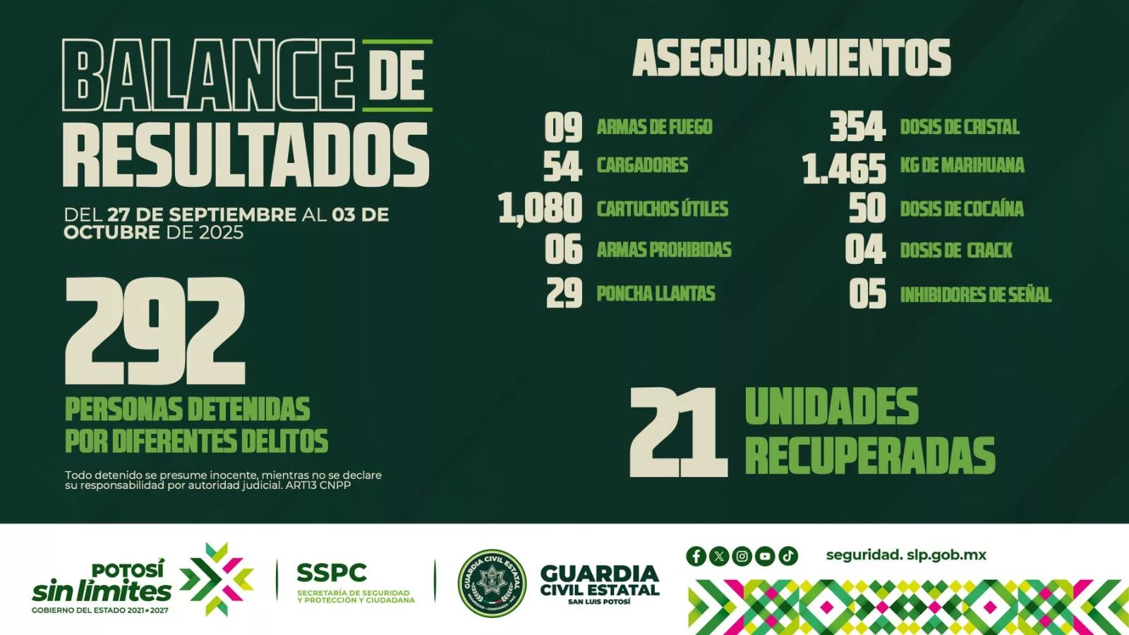 En el balance de resultados informado por la Secretaría de Seguridad y Protección Ciudadana del Estado, se resaltó la detención de 292 personas, en el periodo comprendido del 27 de septiembre al 03 de octubre del año en curso, en donde la Guardia Civil Estatal puso a disposición de la Fiscalía General de la República a dos personas y 290 ante la Fiscalía General del Estado.