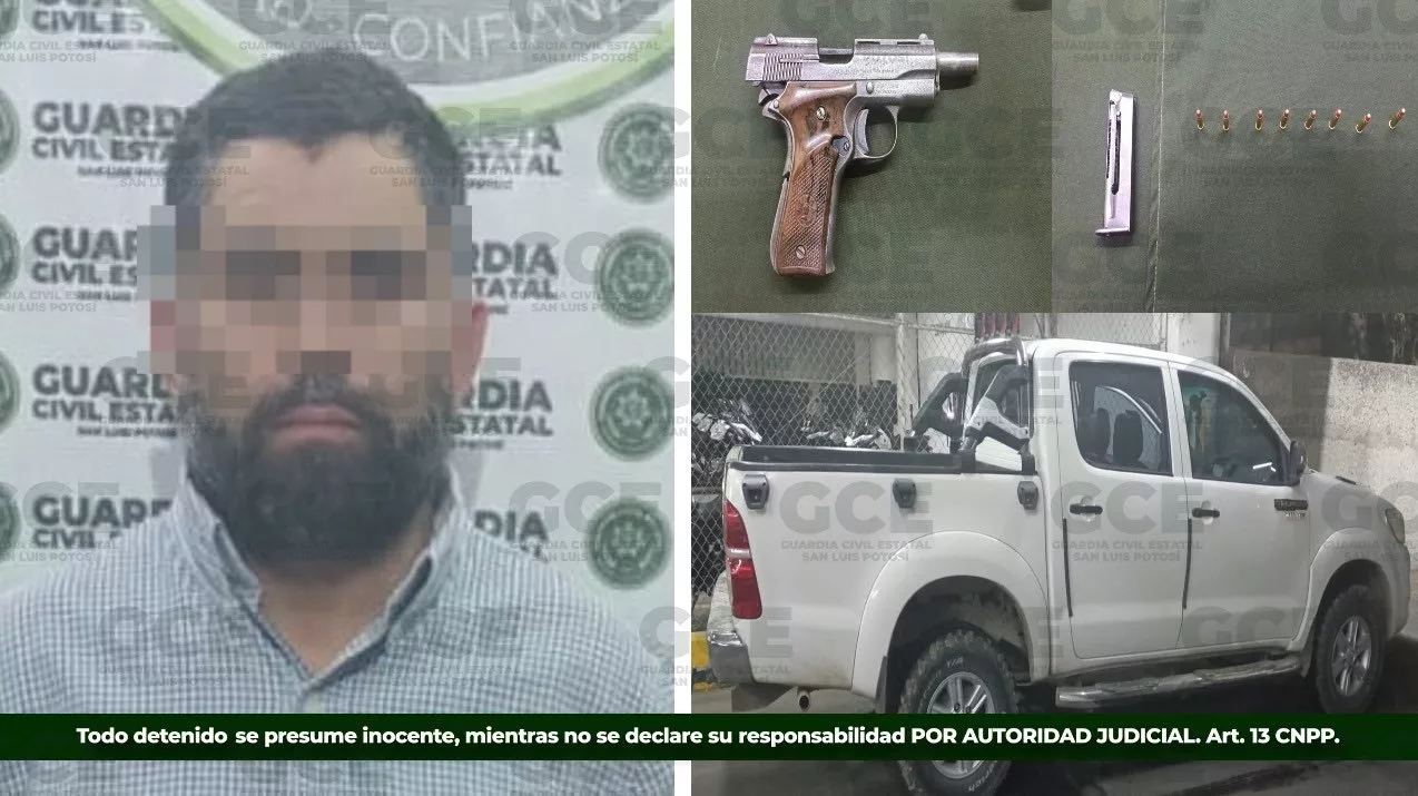 En el municipio de Santa María del Río fue detenido Luis Enrique “N”, de 44 años, a quien se le aseguró un arma de fuego tipo pistola calibre .22, con un cargador, ocho cartuchos útiles y una camioneta.