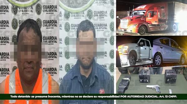 Nuestros agentes de la Guardia Civil Estatal detuvieron a Arturo “N” de 45 años y a Fernando “N” de 42 años, ambos con antecedentes por el delito de tráfico de personas, quienes fueron asegurados con dos tractocamiones con reporte de robo en la carretera federal 57 a México, a la altura de la comunidad El Cerrito, en el municipio de Santa María del Río.