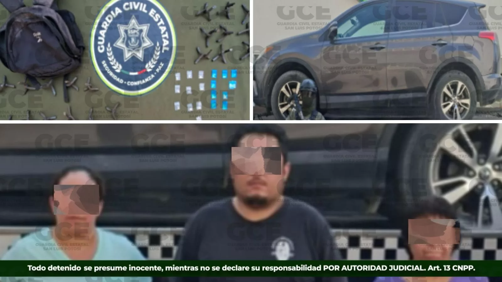 Como parte de los trabajos preventivos en la Huasteca potosina, la Guardia Civil Estatal detuvo a Luis “N”, de 39 años; Natali “N”, de 40 años; y Rosalba “N”, de 68 años, presuntos responsables de actos constitutivos de delito, cometidos en agravio del patrimonio de la ciudadanía y por delitos contra la salud.